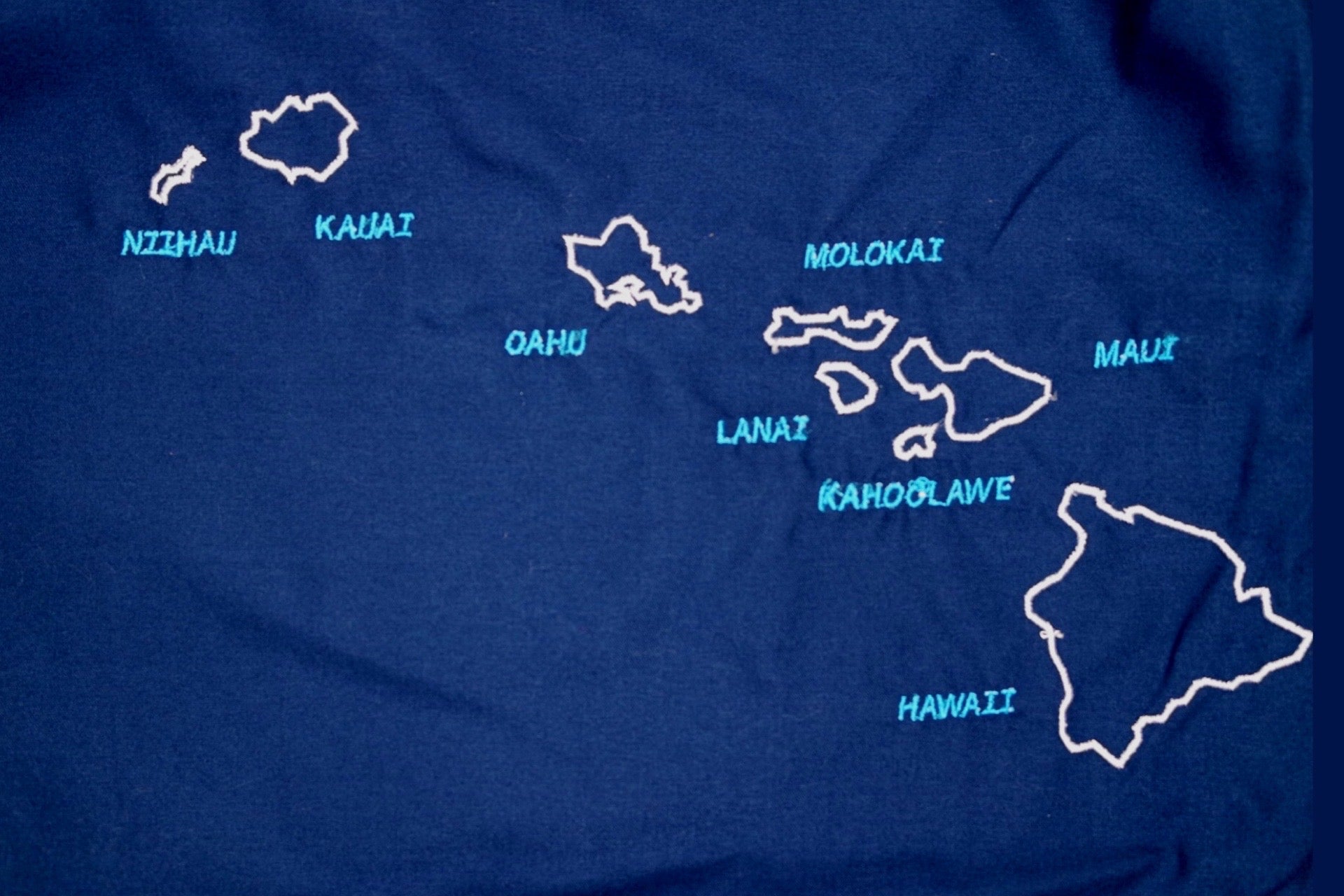 Navy blue shorts with teal hibiscus flower in the front. Hawaii and Hawaiian islands in teal, in the back. Made of 100% microfiber polyester. Designed and shipped from Hawaii and made in Vietnam. Colors and fabric may vary from picture depending on cut.