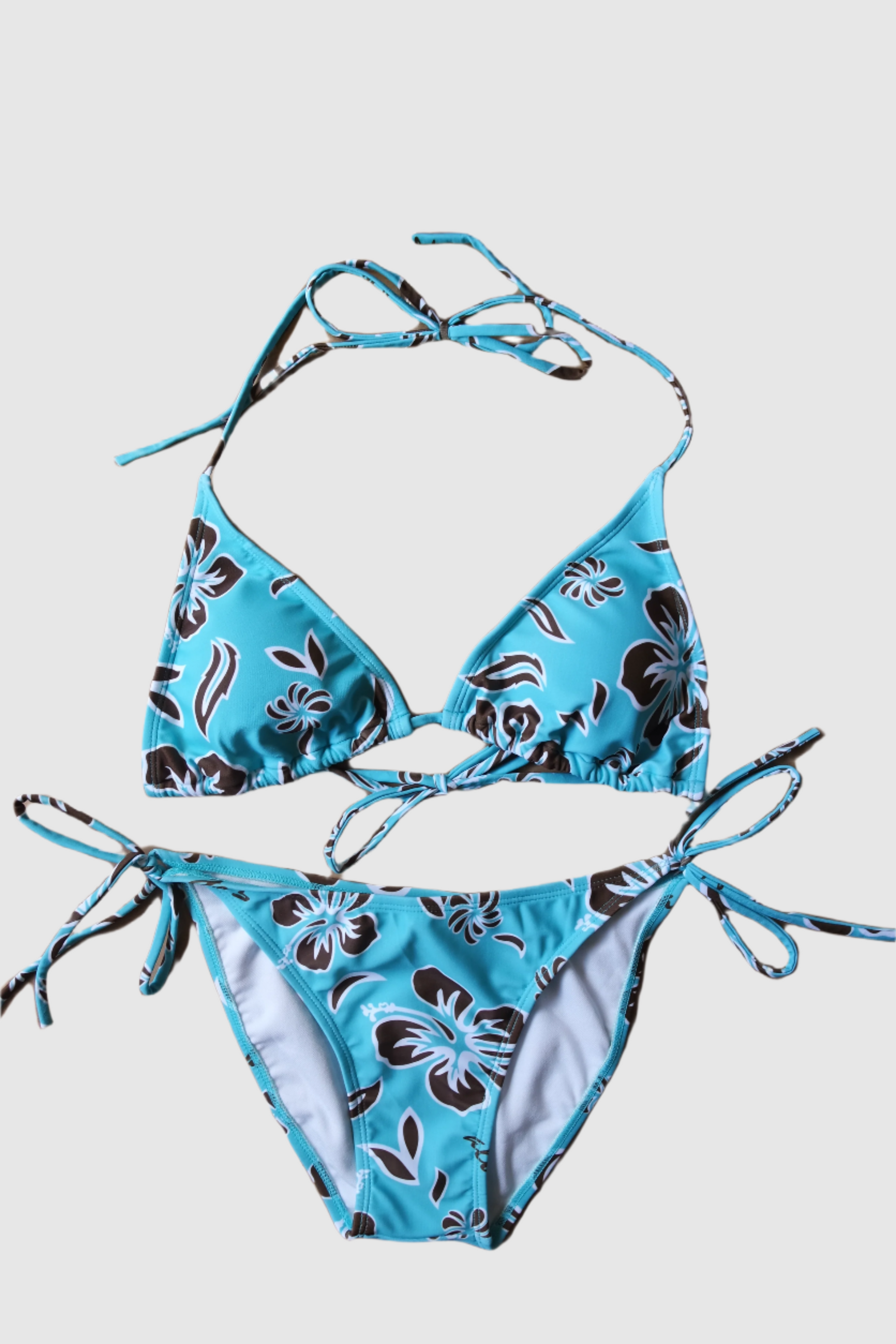 Two Piece String Bikini Set - Teal and Brown Hawaiian Floral Print